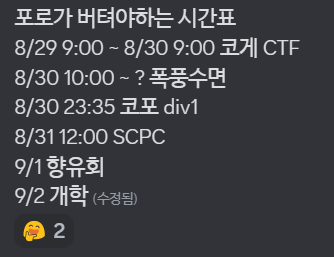 올해는 CTF보다 PS에 훨씬 많은 시간을 투자하고 있기에, 실력적으로 많은 성장을 이루지도 못했고 만족할만한 성과가 많이 나오지도 않았습니다. 물론 데프콘 파이널은 예외입니다. 다들 정말 감사합니다. 😆