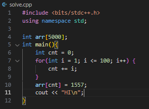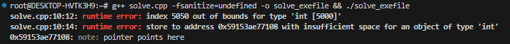 눈썰미가 좋은 사람들은 cnt가 최종적으로 5050이 되고, 크기 5000짜리 배열에서 5050번째 원소를 참조하는 UB를 바로 눈치챘을 것이다. 허나 당장 i <= 99로 범위가 1만 줄어도 cnt는 허용 범위 안으로 들어오고, 저런 코드가 100줄만 넘어가도 저런 ub를 바로바로 눈치채기는 은근히 힘들다. 하지만 저 sanitizer를 키고 실행을 하면?