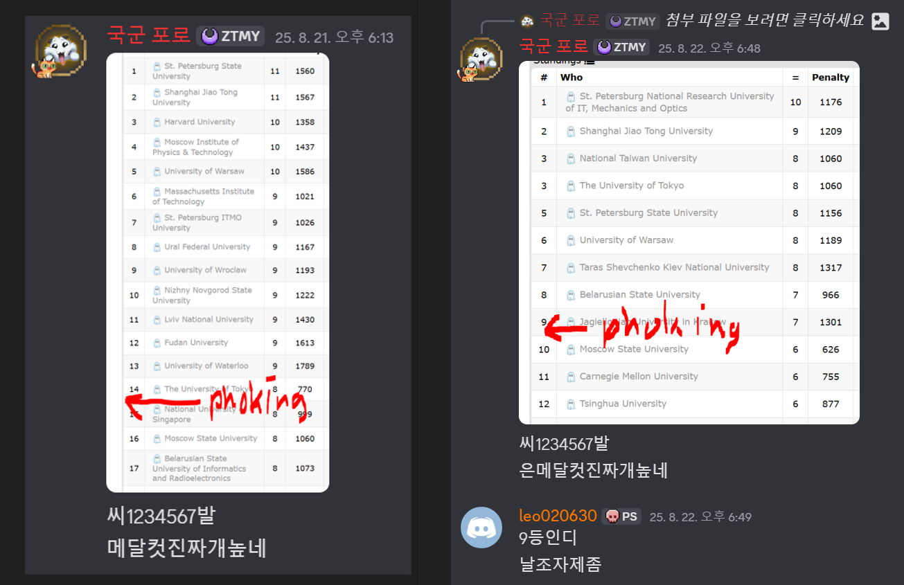 World Final의 결과는 별로 좋지 못했지만, 딱히 우리끼리 셀프 피드백을 하진 않았다. 군대 이슈로 petamingks가 저세상으로 가버리면서 AllSolvedIn1557로 다시 뛸 일이 없었기 때문이다. 대신 저세상에서 기적적으로 전역을 성공한 후 돌아온 slah007이 합류하면서 새로운 팀, PhoKing이 탄생하게 되었다.
